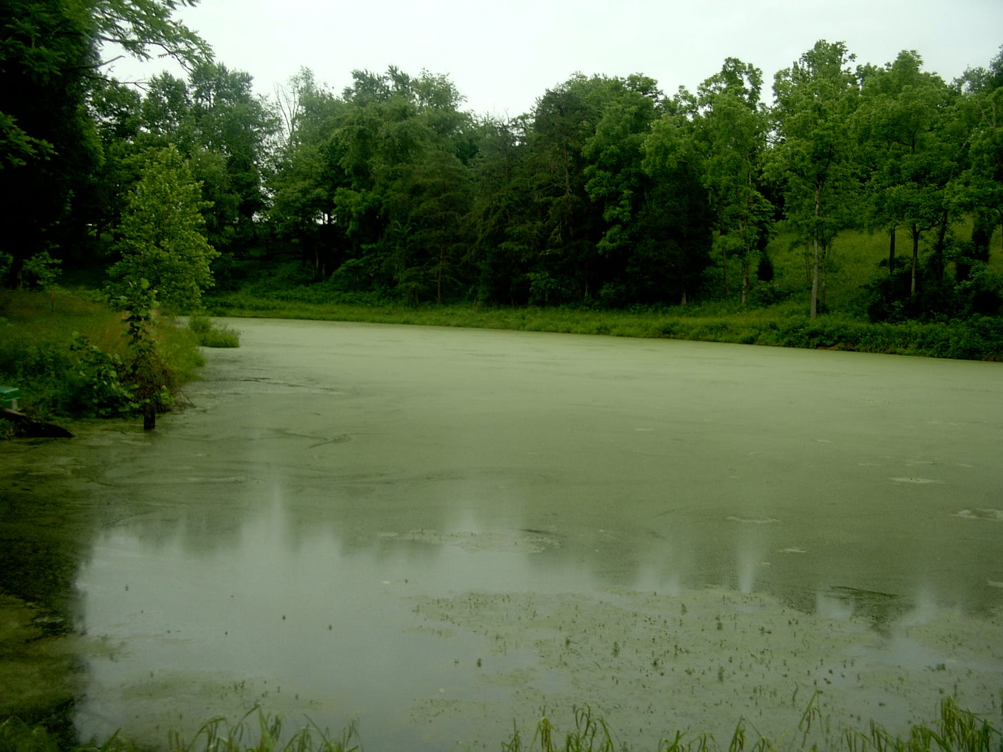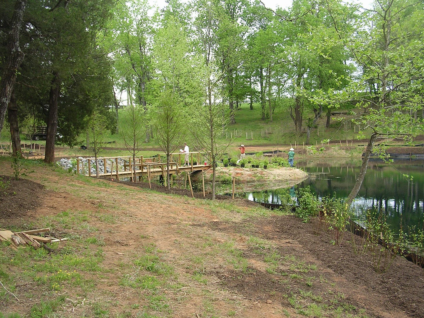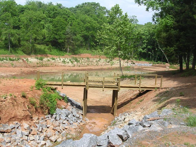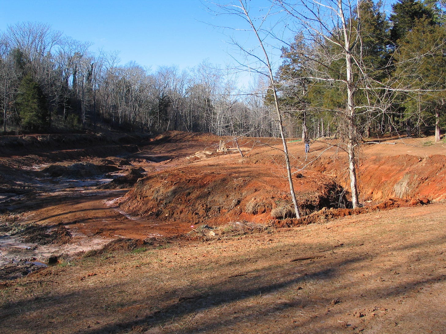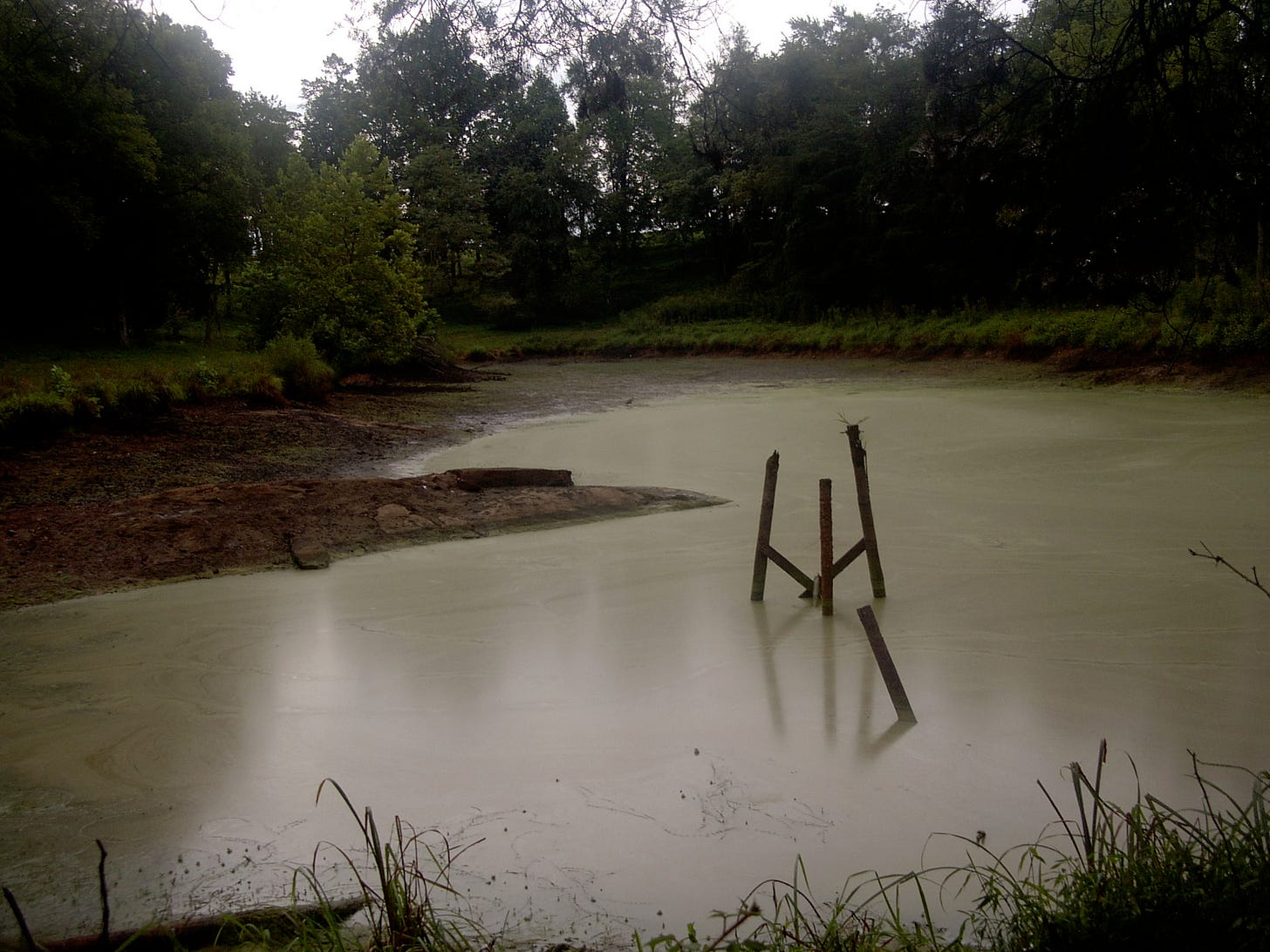 With each rain, the pond turned clay red. Otherwise it was marsh green and returning to land. The pond’s dam was full of trees which were eroding the dam’s stability.