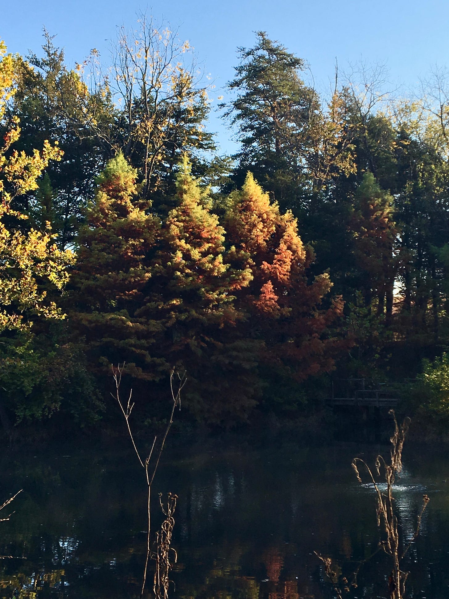 We planted bald cypress who thrived and walked their knobby knees down into the water within just a few years. We planted pond cypress along the far bank and the deer only rubbed one of them to ruin. We planted Arrowwood Viburnum, Virginia Sweetspire, red twig dogwood, sweet pepper bush, winterberry holly, and northern bayberry shrubs. The bayberry did not make it.